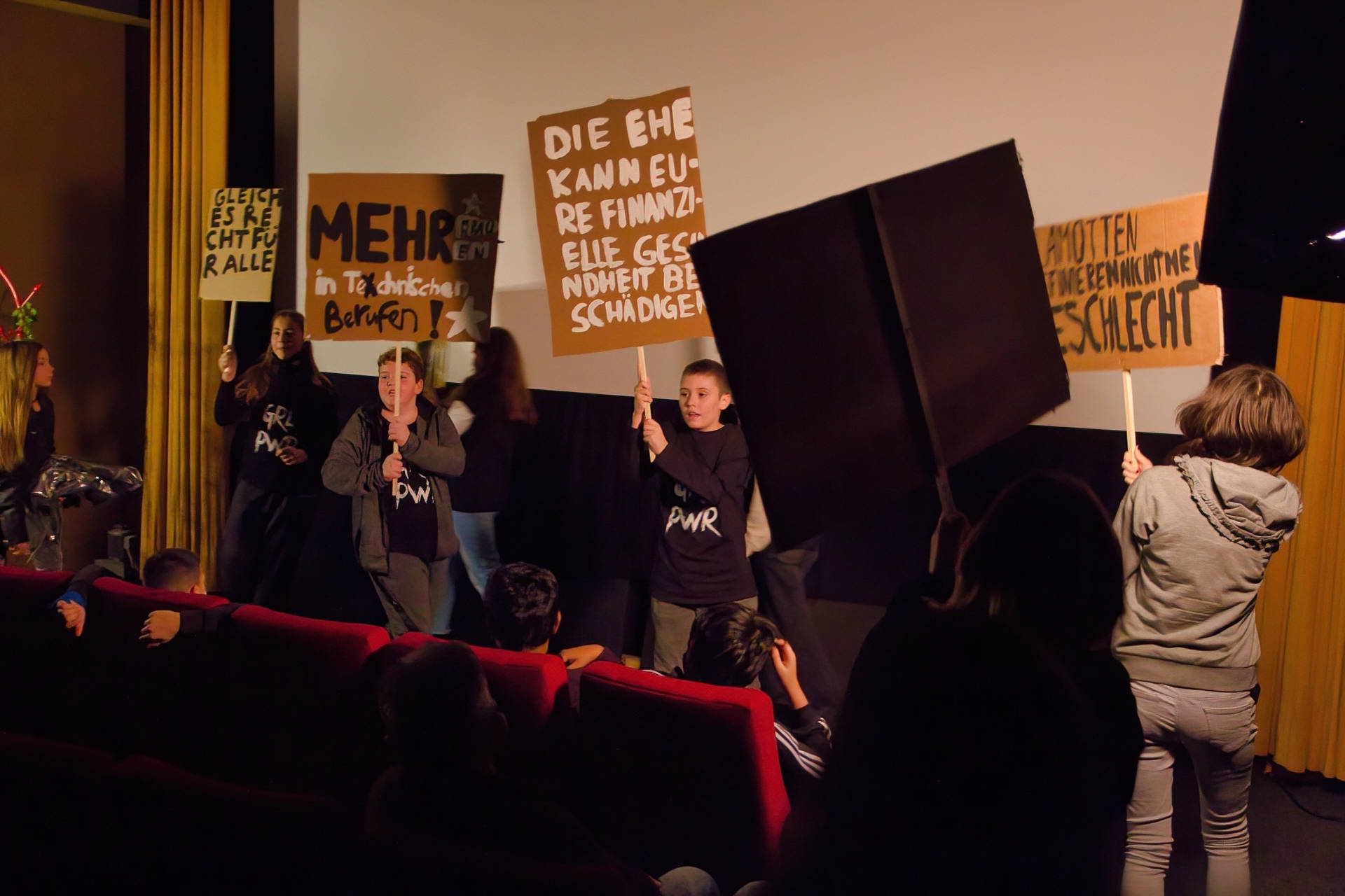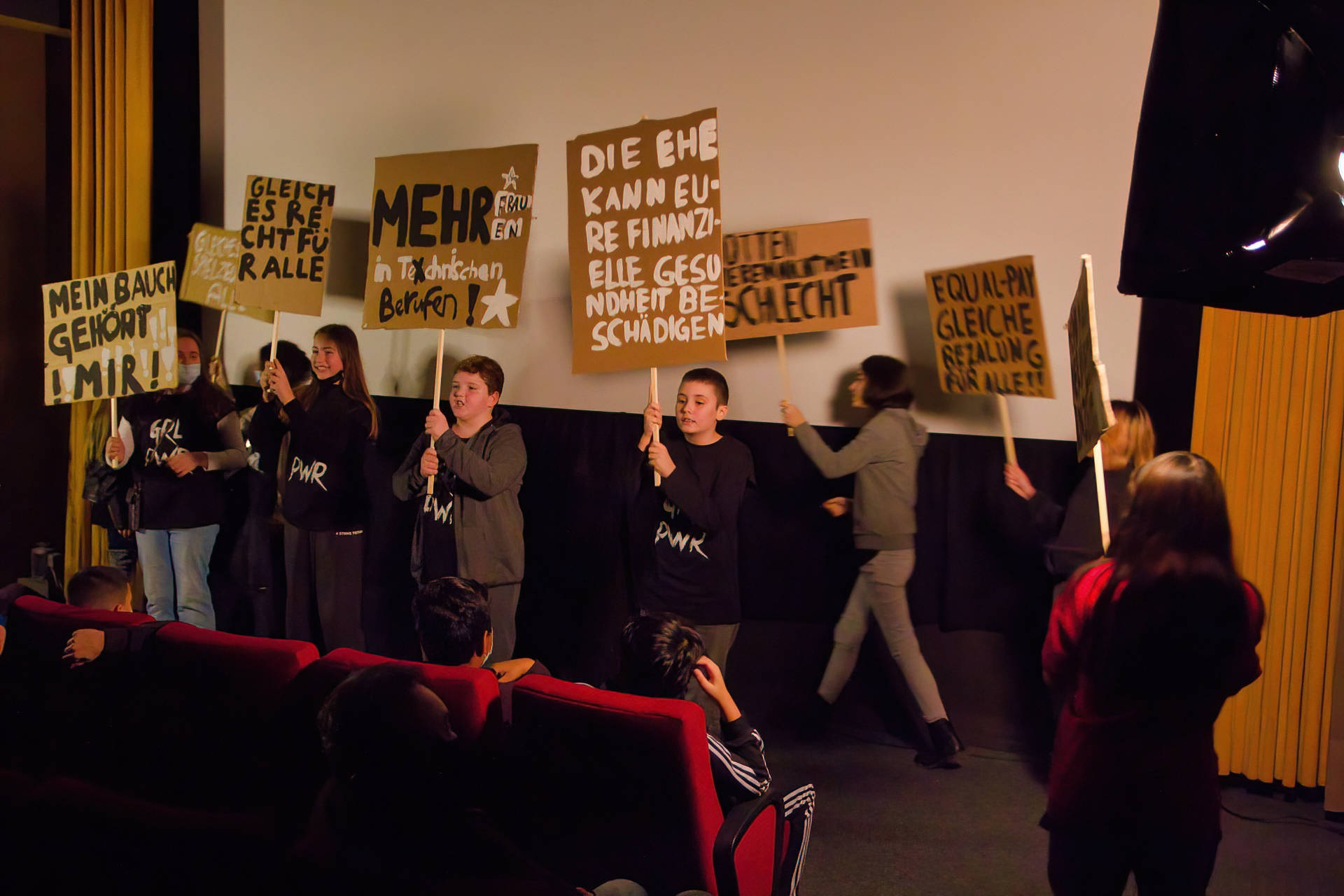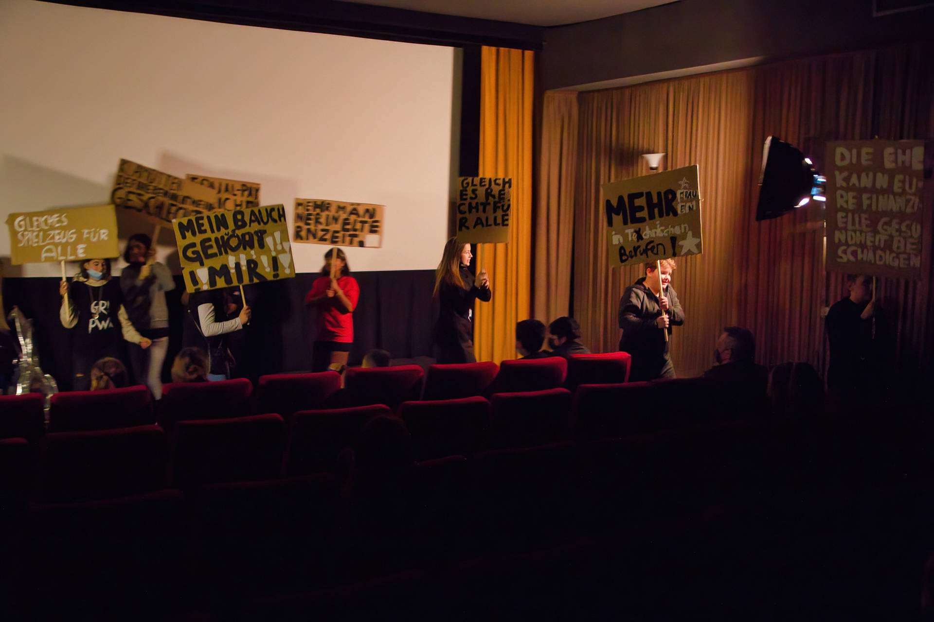 Die 7 Live Szenen begannen mit Alicia, die von den Göttern auf die Erde gesandt wurde, um die Ursachen des Gender-Pay-Gap zu erforschen. Zu ihrer Landung flog ein verschieden farbig blinkendes Ufo in den Kinosaal. In kurzen Live Szenen traten anschließend sowohl Konflikte, als auch Benachteiligungen aus dem Alltagsleben zu Tage. Neben einer Demo mit Schildern zum Equal Pay, gleichem Recht für alle oder gegen den Paragraph 218, wurde lauthals auch eine Neufassung des Schlagers aus den 1970er Jahren „Das bisschen Haushalt ist doch kein Problem“ gesungen. Auch eine schier endlose Liste berühmter Frauen wurde vorgetragen (Erfinderinnen, Politikerinnen, Künstlerinnen, Wissenschaftlerinnen, Völkerrechtlerinnen etc.). Die Performance endete mit der Vision einer gleichberechtigten Welt und Alicia’s Fazit „Das muss das Paradies auf Erden sein.“